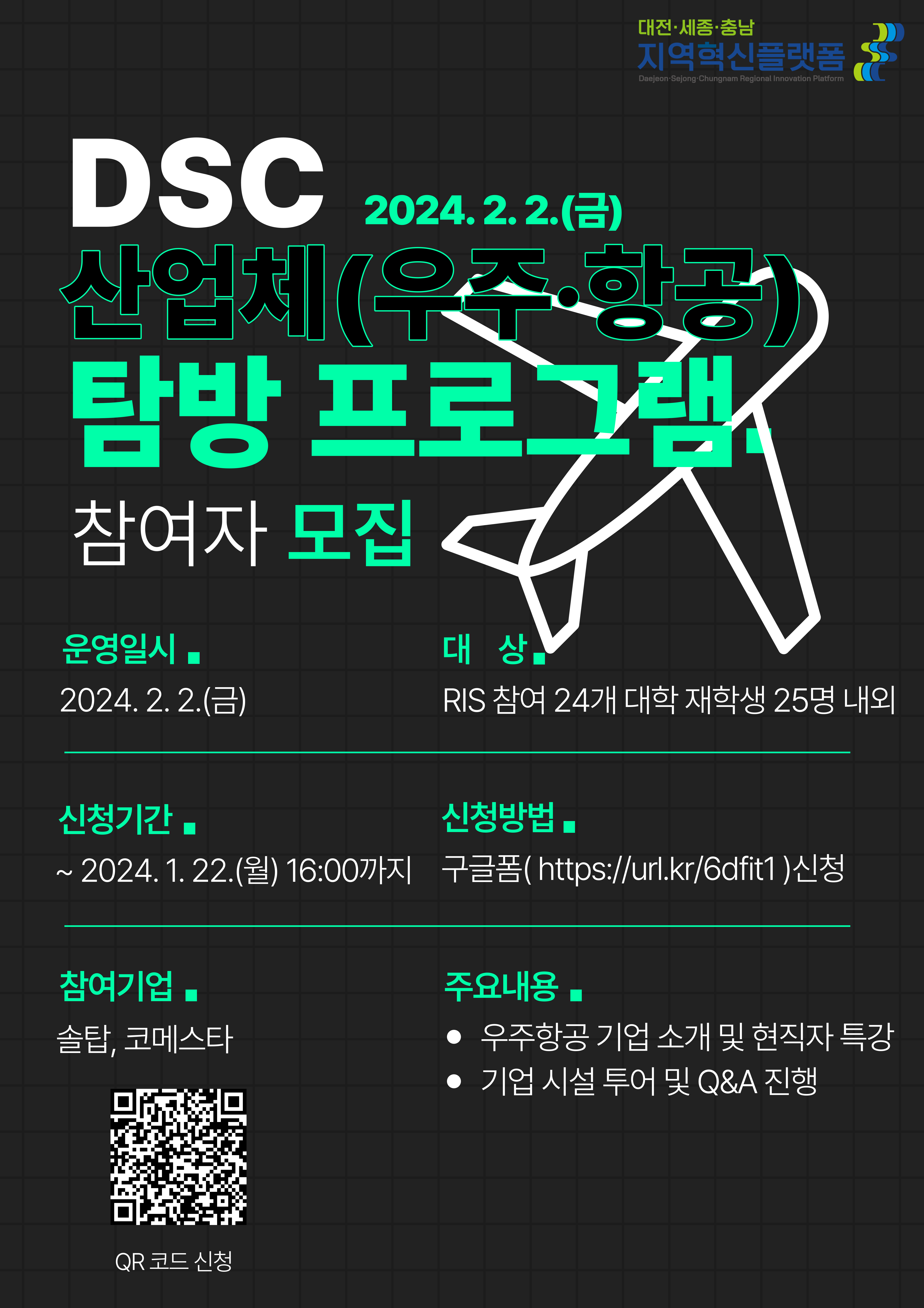 [DSC 공유대학] DSC 지역혁신플랫폼 산업체(우주·항공) 탐방 프로그램 참여자 모집 안내
