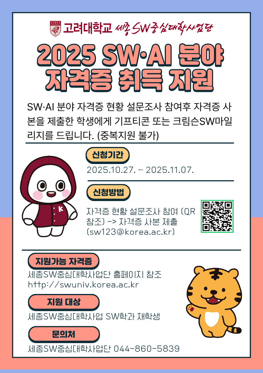 세종SW중심대학사업단에서는 참여학과 학생들의 SW·AI 능력 함양 및 전문성 강화를 목적으로 아래와 같이 SW·AI 분야 자격증 취득 지원을 실시합니다.