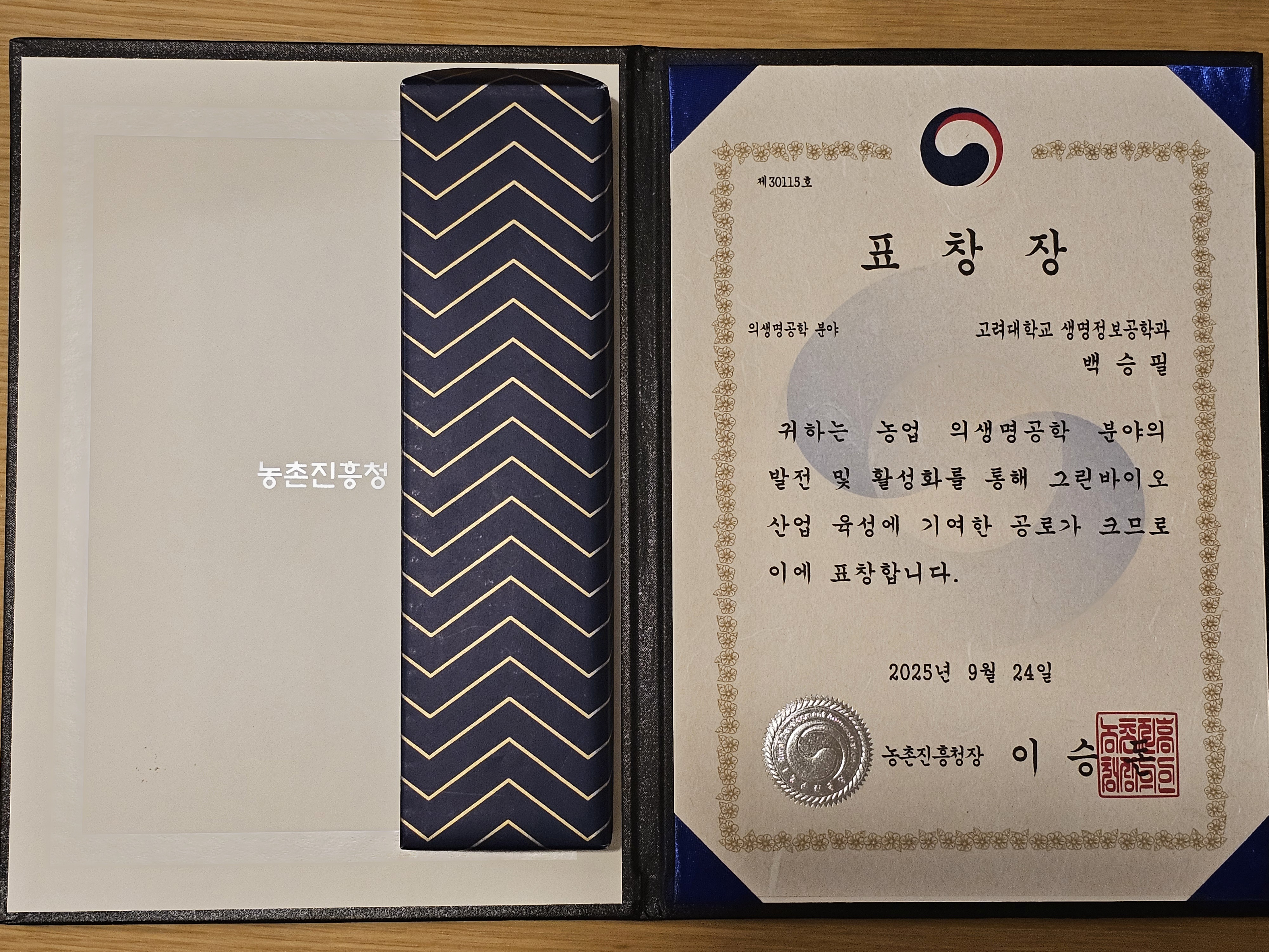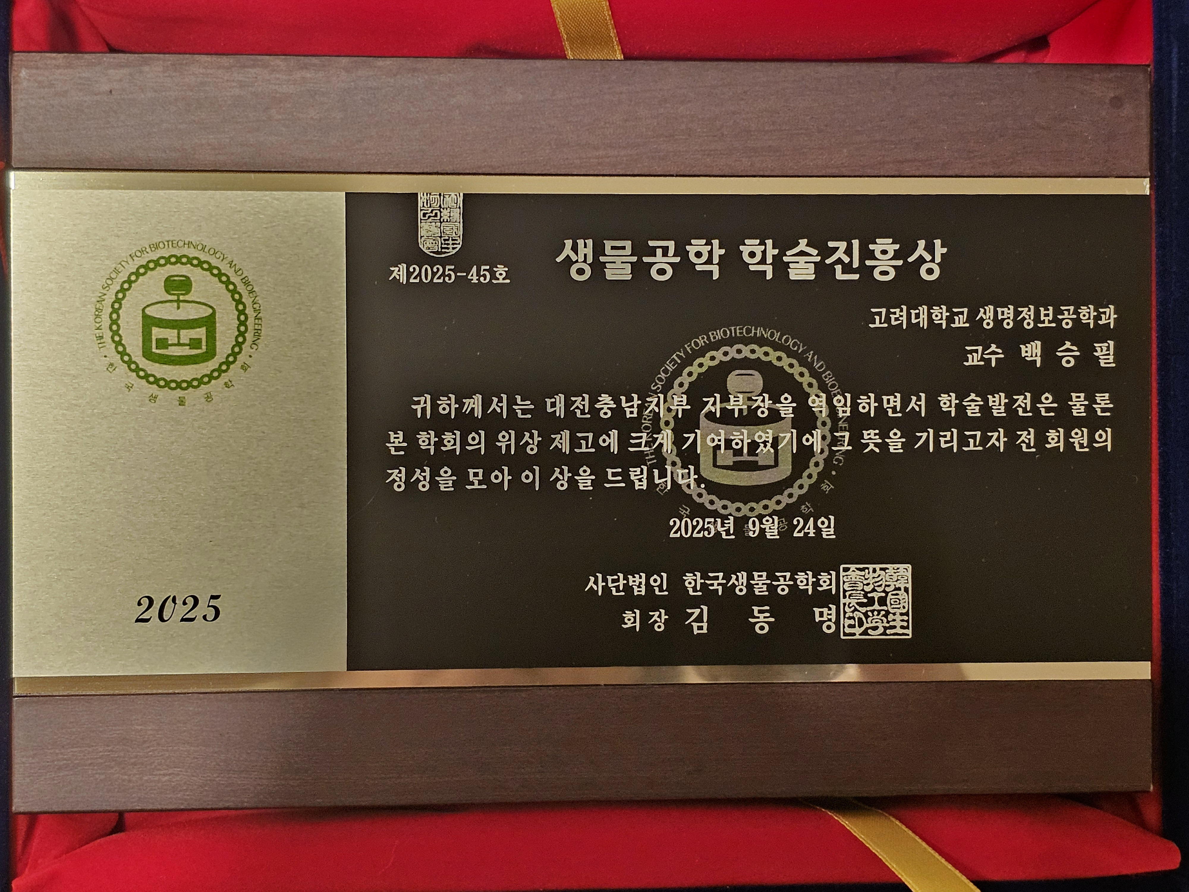 고려대학교 세종캠퍼스(부총장 양지운) 생명정보공학과 백승필 교수가 지난 9월 24일 인천그랜드하얏트호텔에서 열린 한국생물공학회 KSBB-AFOB Conference 2025에서 농촌진흥청 의생명공학 분야 표창장과 한국생물공학 학술진흥상을 동시에 수상했다. 이번 수상은 백 교수가 지역 혁신 바이오헬스 산업 발전과 생명공학 연구 분야에서 이룬 탁월한 성과를 인정받은 결과다.